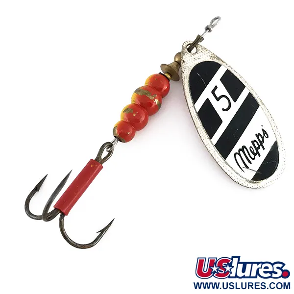 Solidus 8 cm profilis paverčia šią 5 dydžio sukriukę (produkto kodas 8045) puikiu pasirinkimu didelėms lydekoms ir maskinongams. 14 g svoris yra sutelktas žalvariniame korpuse ir keturiuose ryškiuose raudonai geltonuose karoliukuose. Didelis sidabrinis lapelis papuoštas kontrastingas juodai baltu įstrižu raštu, kurio centre – ikoniškas skaičius „5“ ir Mepps užrašas. Apvertus lapelį matomas autentiškas „MADE IN FRANCE“ spaudas, nurodantis aukštos kokybės komponentus, naudojamus surenkant masalą JAV. Galinėje dalyje yra aštrus trišakis kablys, kurio kotelis apsaugotas klasikiniu raudonu kembriku. Matomi nedideli naudojimo vandenyje požymiai, tačiau karoliukų ir sidabrinio lapelio būklė išlieka 4/5. Kūgio formos sukimosi sistema užtikrina tolygų sukimąsi ir sukuria specifines vibracijas, kuriomis garsėja šis modelis.