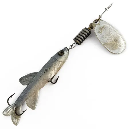 Ant šio egzemplioriaus sidabruoto lapelio išlikęs kultinis įspaudas „French Patent“, pabrėžiantis jo kilmę iš 8-ojo dešimtmečio vidurio. Ši 6 g (3/16 oz) svorio „Mepps Comet 2 Mino“ sukrė, žymima prekės kodu 17483, susideda iš Prancūzijoje pagamintų komponentų, o surinkta buvo JAV. Sidabrinė spalva dominuoja visoje konstrukcijoje – nuo poliruoto metalinio lapelio iki minkšto plastiko žuvelės korpuso su žvynų raštu. Maždaug 7,6 cm (3 colių) ilgio masalą sudaro žalvarinis rumbuotas svoris ir uodegėlė, imituojanti nedidelį mailių. Būklė vertinama solidžiais 4 balais iš 5: matomi nedideli vintažinio amžiaus požymiai, tačiau išlaikytas uodegėlės lankstumas ir aštrūs kabliukai. Lapelio metalinis paviršius išliko skaidrus, todėl išspaustos prekės ženklo detalės puikiai matomos atspindinčiame fone.
