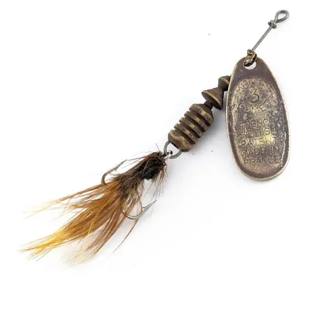 Ant žalvarinio lapelio aiškiai iškalta kultinė „3 COMET“ bei Prancūzijos ir Didžiosios Britanijos patentų žymos; ši praėjusio amžiaus vidurio sukrė atspindi „Mepps“ prekės ženklo transatlantinę istoriją. 6,5 g svorio masalas pasižymi moduline konstrukcija, kurios 7 cm vielinis rėmelis leidžia greitai pakeisti trišakį kabliuką su plunksnomis. Šie komponentai buvo pagaminti Prancūzijoje ir vėliau surinkti JAV – tai buvo įprasta 1960-ųjų praktika, apibūdinanti 20052 modelio erą. Žalvarinį korpusą sudaro išskirtinis rumbuotas cilindras ir kūginis tarpiklis; matomas natūralus nusidėvėjimas atitinka 3/5 būklės įvertinimą. Kabliukas tebėra papuoštas originaliomis rudos ir gelsvos spalvos plunksnomis, suteikiančiomis masalui natūralų profilį. Šis egzempliorius demonstruoja klasikinę prancūzišką lapelio geometriją, skirtą įvairiam užmetimui bei traukimui.