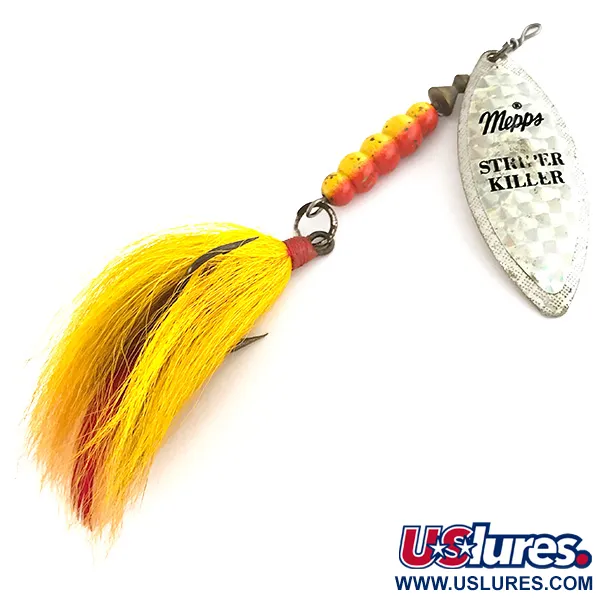 Ši Prancūzijoje pagaminta sukrė, sverianti solidžius 30 g (1 oz), turi didelį sidabrinį lapelį, ant kurio išspausti „Mepps Striper Killer“ ir „Giant Killer“ pavadinimai. Ryškiai geltonų ir raudonų karoliukų seka sudaro segmentuotą korpusą, užsibaigiantį gausiai papuoštu trišakiu kabliu su geltonomis plunksnomis ir raudonu akcentu apačioje. Šis konkretus pavyzdys, identifikuojamas pagal prekės kodą 7434, yra 12 cm (4 3/4") bendro ilgio ir puikios 5/5 būklės. Kitoje lapelio pusėje aiškiai matomas „Made in France“ ženklas ir „Giant Killer“ prekės ženklas, atspindintis vieno žinomiausių pasaulyje žūklės įrankių gamintojų paveldą. Skirta stambiems plėšrūnams giliame vandenyje žvejoti, sunki konstrukcija ir plunksninė uodega sukuria ryškų profilį, neprarandant metimo nuotolio. Vielinio rėmo tvirtumas ir sidabrinės apdailos švara paverčia šią sukrę aukštos kokybės vintažinės Mepps produkcijos pavyzdžiu.