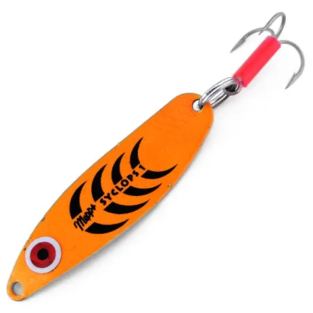Ryškiai oranžine spalva padengtas išlenktas šios blizgės korpusas turi kontrastingas juodas žymes, kurios pereina į specialų UV spinduliams reaguojantį švytėjimą, užtikrinantį matomumą giliame ar drumstame vandenyje. 12 g (2/5 oz) svorio ir 6 cm (2 1/4") ilgio Mepps Syclops 1 (produkto kodas 10305) yra 5/5 būklės ir atrodo nenaudota. Ryški raudonai balta akis yra šalia kilpelės, suteikianti plėšrūnams aiškų taikinį. Konstrukciją sudaro tvirtas žiedelis ir trišakis kabliukas su raudonu atakos vamzdeliu – tai firminis Mepps bruožas, būdingas daugeliui jų JAV pagamintų masalų. Ant metalinio korpuso išspausta dešimt skirtingų atspindinčių paviršių, kad traukiant masalą šviesa būtų atspindima įvairiais kampais.