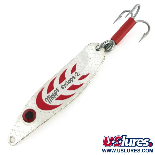 Lenktas „Mepps Syclops 2“ korpusas su tekstūriniu sidabriniu žvynų raštu atspindi aukščiausią prancūziškos žvejybos įrangos meistriškumą. Ši 7,5 cm (3") vartiklė sveria 17 g (3/5 oz), todėl yra universalus įrankis tolimiems metimams ar žvejybai didesniame gylyje. Iškiloje pusėje aiškiai matomas „Mepps Syclops 2“ įspaudas, apsuptas ryškių raudonų ugnies akcentų, kontrastuojančių su sidabro danga. Įgaubtoje vidinėje pusėje „Mepps France“ ženklas išlieka ryškus ir įskaitomas, o tai patvirtina nepriekaištingą (5/5) šio egzemplioriaus būklę. Furnitūra ne mažiau įspūdinga: tvirtas žiedelis sujungtas su trišakiu kabliu, kurį saugo firminis raudonas plastikinis vamzdelis. Pagal prekės kodą 9348 atpažįstamas masalas neturi jokių nusidėvėjimo žymių ir išlaiko originalų gamyklinį blizgesį. Šalia valo tvirtinimo vietos priklijuotas išskirtinis raudonos ir juodos spalvos akies lipdukas, suteikiantis dizainui akcentą.