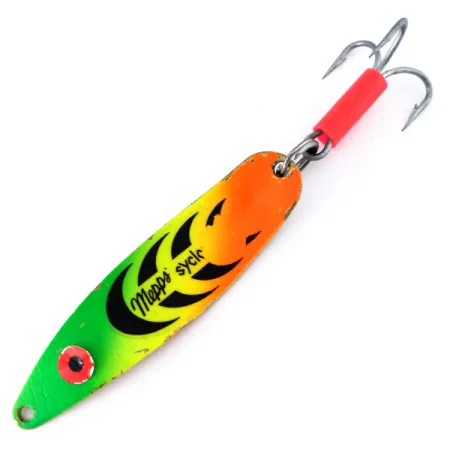 „Fire Tiger“ spalvos sklandžiai pereina iš ryškios „chartreuse“ žalios priekyje į gilią oranžinę gale šioje 17 g (3/5 oz) blizgėje. 7,5 cm (3") ilgio metalinis korpusas pasižymi juodais, į šonkaulius panašiais akcentais ir charakteringa raudona akimi. Ši konkreti Mepps Syclops 2 UV, pažymėta produkto kodu 10538, sukurta matomumui; UV spinduliams reaguojanti apdaila užtikrina ryškų švytėjimą gilesniame vandenyje arba debesuotu oru. Trišakis kabliukas turi raudoną kirtimo indikatoriaus vamzdelį – klasikinį prancūzų gamintojo akcentą. Būklė vertinama tvirtu 4/5 balu, dažai ir žymėjimai išlieka ryškūs ir aiškūs visame paviršiuje. Prekės ženklas tvarkingai įspaustas šalia juodų pusmėnulio formų ant išgaubtos blizgės pusės.