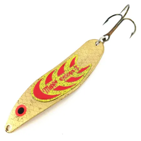 Ši 26g (1oz) sverianti masyvi blisgė sukurta tolimiems metimams ir žūklei dideliame gylyje. Auksinis korpusas turi įspaustą žvynų raštą, kuris atspindi šviesą per visą 9cm (3 1/2") ilgį. Ši Mepps Syclops 3, identifikuojama pagal prekės kodą 9642, yra klasikinė prancūziško dizaino įranga, pagaminta Amerikos rinkai. Ryški raudona ir geltona grafika išgaubtoje pusėje atlieka dvigubą funkciją – geltonas pigmentas yra fosforinis, užtikrinantis matomumą giliame ar drumstame vandenyje. Ryški raudonai juoda akis šalia tvirtinimo kilpelės sukuria didelio kontrasto tašką puolimui. Paviršiaus būklė išlieka puiki ir gerai išlaikyta, vertinama 5/5. Blisgė komplektuojama su tvirtu trišakiu kabliu ir sustiprintu žiedeliu.