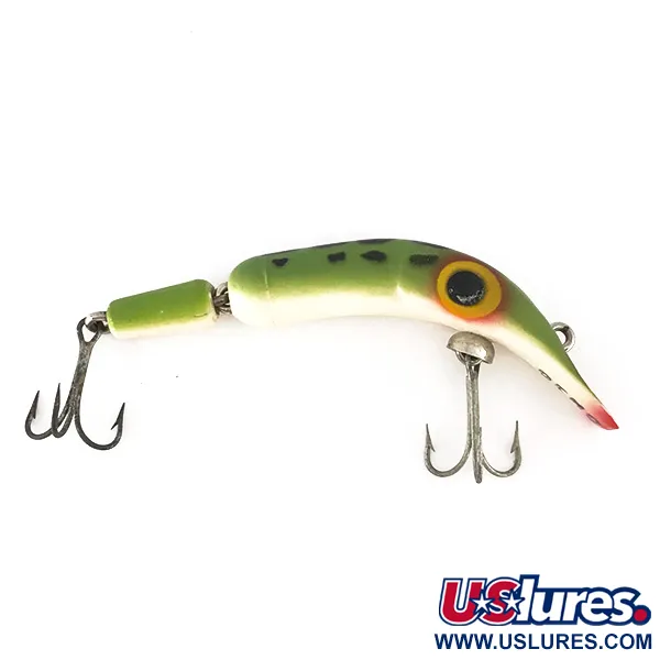 Šis Mill Run Beno su klasikiniu Frog dažymu – tamsiomis dėmėmis ant žalios nugaros – yra puikus vidurio amžiaus Amerikos masalų dizaino pavyzdys. 8 cm nariuotas kūnelis susideda iš dviejų dalių, užtikrinančių išskirtinį profilį žvejojant sekliuose ir vidutinio gylio vandenyse. Šis egzempliorius, sveriantis universalius 7 g, žymimas prekės kodu 7846. Raudonai dažytas liežuvėlis sukuria ryškų vizualinį kontrastą su gelsvai balta pilvo dalimi, o didelės geltonai juodos akys įtaisytos priekinėje išgaubtos galvos dalyje. Konstrukcija sutvirtinta metalinėmis plokštelėmis ir sraigtinėmis kilpomis, kurios tvirtai laiko du trišakius kabliukus. Šis konkretus masalas yra išskirtinai gerai išsilaikęs, įvertintas 5/5 būkle dėl nepriekaištingo dažymo ir švarių metalinių dalių.