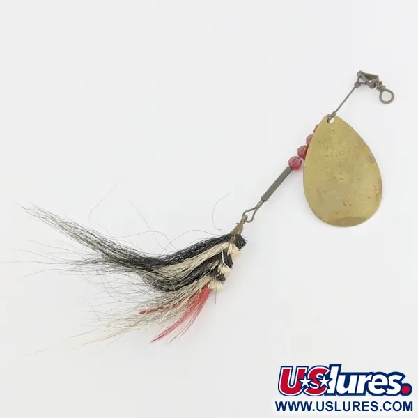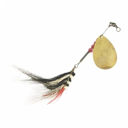 Poliruotas žalvaris suteikia šios Miller #3 MFG Springwater sukrės lašo formos lapeliui klasikinį spindesį. 10 cm (4 colių) ilgio masalas sveria 7 g (1/4 uncijos), todėl puikiai užsimeta. Trys skaidrūs raudoni briaunoti karoliukai sukuria vizualinį kontrastą vielos ašiai ir žalvarinėms detalėms. Šis masalas, kurio prekės kodas 24496, demonstruoja Miller Fishing Lure Co. meistriškumą nuo pat 1929 metų. Kabliukas yra gausiai papuoštas juodų ir baltų plaukelių kombinacija, užbaigta ryškiai raudona plunksna gale. Bendros būklės įvertinimas yra 4/5. Metalinis tarpiklis atskiria karoliukus nuo kilpelės, užtikrindamas, kad lapelis laisvai suktųsi aplink ašį.