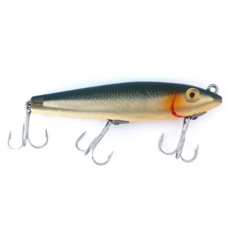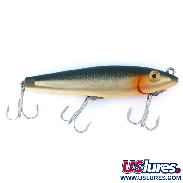 Žvynų rašto šonai su prabangia aukso apdaila apibūdina šį L&S Bait Mirrolure 7M24 – klasikinį paviršinį „walker“ tipo masalą iš JAV. Šis 11 cm (4 1/4") ilgio ir 11 g (2/5 oz) svorio modelis pasižymi sodriai melsvai žalia nugara, pereinančia į tekstūruotus metalinius šonus, papuoštus ryškiai raudona žiaunų žyme prie galvos. Didelės, ryškios geltonos akys įtaisytos iškart po viršutine kilpele valui tvirtinti – tai būdinga 7M serijos konstrukcija, skirta žvejybai pačiame vandens paviršiuje (0 m gylyje). Su trimis aštriais trišakiais kabliukais, kurių metalas išlieka blizgus ir funkcionalus. Šis egzempliorius, kurio prekės kodas 10990, yra puikios būklės (įvertinimas 5/5). Kolekcininkai įvertins M24 spalvinimą, kuris buvo itin populiarus gaudant ešerius, lydekas ir upėtakius tiek spiningaujant, tiek velkiaujant. Lieknas, cigarų formos profilis sukurtas taip, kad masalas laikytųsi viršutiniuose vandens sluoksniuose.