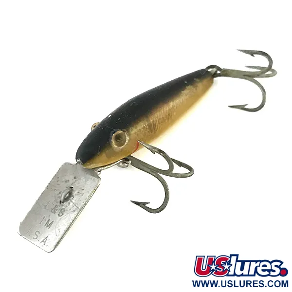 Šis JAV pagamintas nedidelis skęstantis masalas sveria vos 3/32 oz (2,5 g). Šis konkretus MirrOlure egzempliorius, kurio produkto kodas 8501, yra kompaktiško 1 1/2" (4 cm) ilgio ir pasižymi klasikine Gold apdaila su tamsia nugara bei subtiliais raudonais akcentais prie žiaunų. Masalas turi du originalius trišakius kabliukus, pritvirtintus pilvo sraigtu ir galine kilpele. Pastebima šios konstrukcijos ypatybė – stačiakampis metalinis liežuvėlis, ant kurio išspausti gamintojo ženklai. Kūnas rodo savo amžių per švelnų apdailos nusidėvėjimą, todėl jo būklė vertinama 5/5. L&S Bait Company sukurtas skęstančiai žvejybai, kolekcininkai dažnai ieško šių mažesnių variantų, skirtų tokioms rūšims kaip lydeka ar standartinis sterkas. Dažytos akys išlieka ryškios auksinių šonų fone.