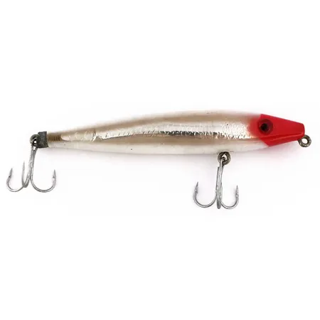 Šis JAV pagamintas paviršinis masalas, sveriantis lygiai 1/2 oz (14 g), yra klasikinis L&S Bait Mirro lure meistriškumo pavyzdys. MirrOlure Top Dog, atpažįstamas pagal produkto kodą 10219, yra 4 1/4" (10,5 cm) ilgio ir pasižymi plūduriuojančia konstrukcija, skirta žvejybai vandens paviršiuje. Šis egzempliorius turi ryškią raudoną galvą, pereinančią į perlamutrinį sidabrinį kūną – tai gerai matomas spalvų derinys, kurį vertina lydekų ir didelių ešerių žvejai. Masalas apginkluotas dviem tvirtais trišakiais kabliukais (vienas pilvo srityje, kitas uodegoje), pritvirtintais patvariais metaliniais laikikliais. Raudonoje galvos dalyje įstatyta paprasta juoda akis, sukurianti aiškų akcentą. Šis konkretus masalas yra puikios būklės, su labai gerai išlaikyta apdaila, kuri vertinama 5/5 balais. Prie uodegos kabliuko laikiklio yra platėjanti metalinė apykaklė, kuri yra specifinė šio plūduriuojančio „walker“ tipo masalo surinkimo detalė.