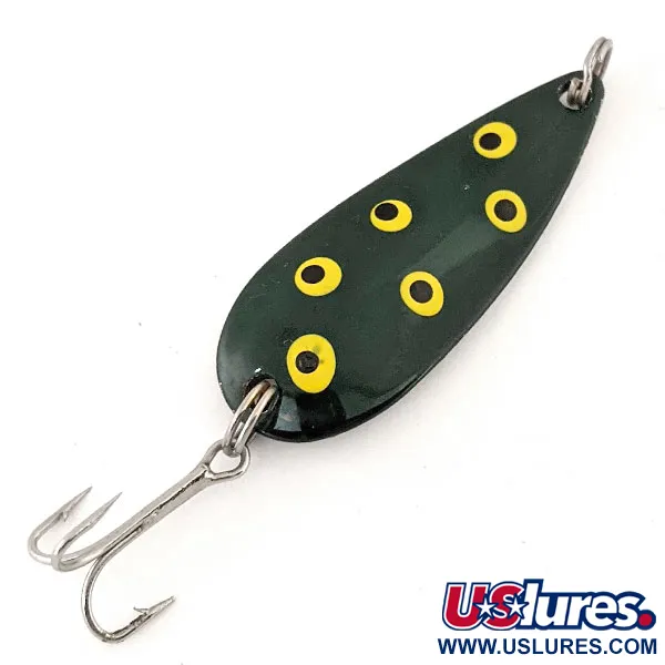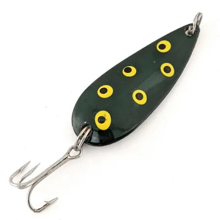 Gili miško žalumos spalva yra pagrindas šešioms rankomis pieštoms geltonoms ir juodoms akims ant šios japoniškos blizgės išgaubtos pusės. 11 g (2/5 oz) svorio masalas yra skirtas spiningavimui atvirame vandenyje arba palei vandens augmeniją. Kita pusė pasižymi poliruoto nikelio apdaila, kuri atspindi šviesą, su įspaustu „Moriyama“ pavadinimu ir „JAPAN“ kilmės nuoroda. 5 cm (2") ilgio lašo formos profilis sukomplektuotas su tvirtu trišakiu kabliu ir originaliais žiedeliais. Kataloguojama produkto kodu 13117, ši blizgė neturi jokių žymių nusidėvėjimo ženklų ir yra puikios 5/5 būklės. Didelio kontrasto varlės raštas apsaugotas storu, blizgiu lako sluoksniu. „Moriyama“ užrašas tiksliai įspaustas į metalą vidinėje išlinkio pusėje.