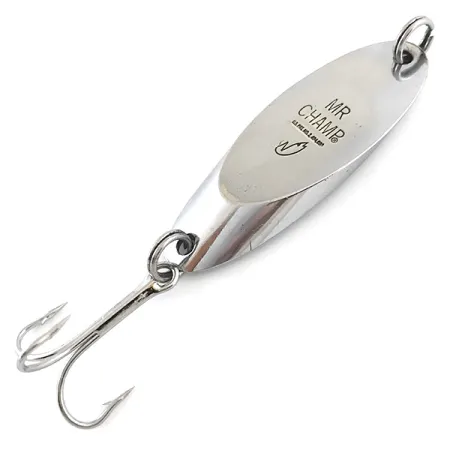Ant poliruoto paviršiaus aiškiai išspaustas „MR CHAMP“ prekės ženklas identifikuoja šį klasikinį amerikietišką Weber pilkerį. Šis 3/4 uncijos (21 g) sunkaus metalo korpusas pasižymi blizgia nikelio apdaila, kuri atspindi šviesą per visą aerodinaminę formą. 2 1/4 colio (6 cm) ilgio egzempliorius turi prekės kodą 5235 ir atstovauja laikotarpį, kai linija dar nepriklausė Luhr Jensen. Priekinėje pusėje yra ikoninis šuoliuojančios žuvies logotipas ir tekstas „MR CHAMP“, o nugarėlė išlieka lygiu, veidrodiniu paviršiumi. Tvirtas žiedelis jungia aštrų trišakį kabliuką su uodega, paruoštą vertikaliam džigavimui arba tolimiems metimams. Šis masalas yra 5/5 būklės, demonstruojantis aukštos kokybės padengimą, kuriuo Weber garsėjo per savo šimto metų istoriją Šiaurės Amerikos rinkoje. Viršutinė kilpelė turi tvirtą žiedą saugiam valo tvirtinimui.