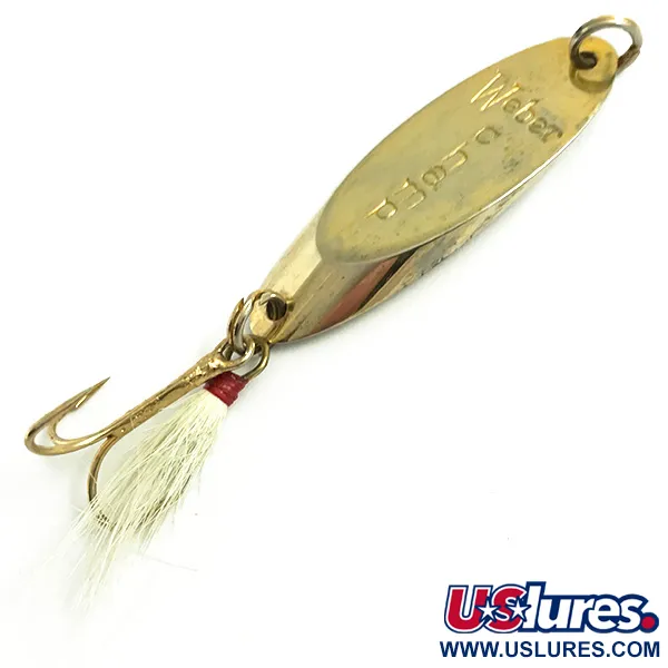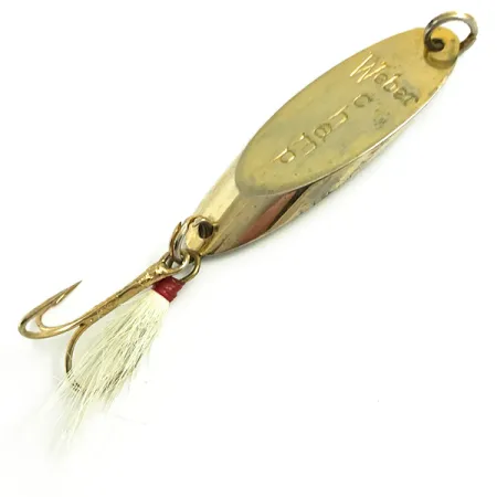 Ant poliruoto 14 g (1/2oz) metalinio korpuso aiškiai iškaltas Weber pavadinimas identifikuoja šį MrChamp kaip amerikietiško žvejybos paveldo dalį iš kompanijos, turinčios šimtametę istoriją JAV ir Kanadoje. Šis 5 cm (2") auksinis egzempliorius, pažymėtas prekės kodu 6068, atspindi dizainą dar iki to laiko, kai prekės ženklas buvo integruotas į Luhr Jensen asortimentą. Jo būklė yra nepriekaištinga, įvertinta 5/5 už išsaugotą paviršiaus blizgesį. Galinėje dalyje sumontuotas trišakis su plunksnomis ir baltais plaukais, pritvirtintais tradiciniu raudono siūlo apvyniojimu. Tvirtas žiedelis priekyje užtikrina patikimą jungtį spiningavimui ar džigavimui.
