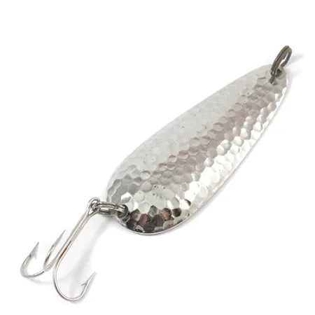Išskirtinė kalta apdaila ant išgaubto paviršiaus apibrėžia šios klasikinės vartiklės vizualinį charakterį. 3 colių (7,5 cm) ilgio ir 1/2 uncijos (14 g) svorio šis Kaltas nikelis modelis pasižymi daugiabriauniu išorės paviršiumi, sukurtu gaudyti šviesą įvairiais kampais. Lygiame viduje metalas pažymėtas gamintojo spaudu, identifikuojančiu jį kaip Nebco Flashbait 166, pagamintą JAV. Šis konkretus egzempliorius, pažymėtas prekės kodu 1975, yra puikios būklės (įvertinimas 5/5), išlaikęs ryškų ir švarų paviršių iš abiejų pusių. Furnitūrą sudaro originalūs žiedeliai ir tvirtas trišakis kablys, neturintis jokių senėjimo požymių. Sunkios vartiklės, tokios kaip ši Nebco, buvo standartinė įranga žvejams, kuriems reikėjo papildomo svorio norint pasiekti tam tikrą gylį arba mesti prieš stiprų pakrantės vėją.