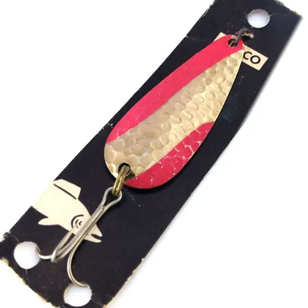 Kalamo aukso tekstūra sudaro šios vintažinės blizgės centrą, kurį rėmina ryškiai rožinės spalvos dažų segmentai. 5,5 cm (2 1/4") ilgio ir 10 g (1/3 oz) svorio Nebco FlashBait 266 yra klasika tapęs amerikietiškas masalas. Ultravioletinėje šviesoje rožinės juostos pasižymi ryškiu švytėjimu – tai techninė detalė, skirta padidinti matomumą giliame ar drumstame vandenyje. Šis konkretus pavyzdys, identifikuojamas pagal prekės kodą 10798, yra nenaudotas ir vis dar pritvirtintas prie originalaus juodo kartoninio pagrindo. Masalas apginkluotas trišakiu kabliu, pritvirtintu ilgu vieliniu segtuku blizgės uodegoje.