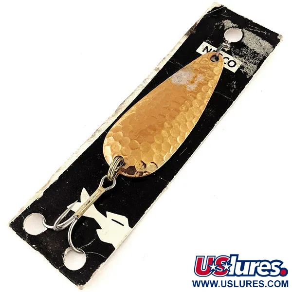 Kalinėto aukso tekstūros dominuoja išgaubtoje šios klasikinės metalinės blisgės pusėje, užtikrindamos itin ryškų atspindį vandenyje. 10 g (1/3 oz) svorio ir 5,5 cm (2 1/4") ilgio Nebco Flashbait 266 (produkto kodas 12448) yra puikus vidurio amžiaus amerikiečių žvejybos įrankių meistriškumo pavyzdys iš Mineapolio, Minesotos. Kitoje pusėje yra lygus, poliruotas paviršius su giliai įspaustu prekės ženklo žuvies logotipu ir „FLASH-BAIT 266 NEBCO“ žymėjimu. Pagaminta JAV, vientiso metalo konstrukcija turi aštrų trišakį kabliuką ir originalius žiedelius. Šis egzempliorius yra nenaudotas, išlaikęs gamyklinį blizgesį, 6 būklės ir vis dar pritvirtintas prie originalios vintažinės pakuotės kortelės.