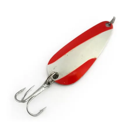 Įstrižai dengti raudonos ir baltos emalės dryžiai puošia šios klasikinės vartiklės priekinę dalį – tai firminė Nebco FlashBait 2662 išvaizda. 2 colių (5 cm) korpusas išštampuotas iš tvirto metalo, o nugarėlė padengta aukšto poliravimo nikeliu, sukuriančiu ryškų kontrastą dažytai pusei. Pagaminta JAV, ši vartiklė nugarinėje dalyje turi aiškiai matomus „FLASHBAIT“ ir gamintojo spaudus. 1/4 oz (8 g) svoris yra universalus lengvosios klasės įrankiais žvejojantiems meškeriotojams, gaudantiems žuvis nuo ešerių iki upėtakių. Šis konkretus vienetas, identifikuojamas prekės kodu 7932, yra nenaudotas ir puikios būklės, išlaikęs originalų gamyklinį blizgesį ant raudonų, baltų ir nikelio paviršių. Tvirtas, sidabrinės apdailos trišakis kabliukas pritvirtintas per patikimą žiedelį vartiklės apačioje.