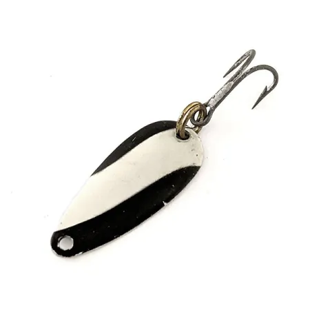 Ant nikeliuotos nugarėlės aiškiai išspaustas „NEBCO FLASHBAIT 466“ žymėjimas identifikuoja šią mažytę JAV pagamintą blizgę. Vos 2,2 cm (0 3/4") ilgio ir tik 1 g (1/32 oz) svorio, šis egzempliorius yra klasikinis ankstyvosios ultralight įrangos inžinerijos pavyzdys iš JAV. Priekinėje dalyje yra ryški, įstriža balta juosta ant juodo pagrindo, sukurianti didelio kontrasto vizualinį raštą. Jos lašo formos profilis pereina į poliruotą nikelio nugarėlę, užtikrinančią ryškų atspindintį paviršių. Mažas žiedelis jungia originalų trišakį kabliuką su uodega, o priekinė kilpelė valui rišti išlieka švari ir atvira. Kataloguota produkto kodu 12114, ši „Nebco“ blizgė reprezentuoja specifinę erą, kai mažo profilio masalai tapo būtini žvejojant ešerines žuvis ir upėtakius. 5/5 būklės, dažai ir nikelio danga išliko išskirtinai gerai išsilaikę ir ryškūs.