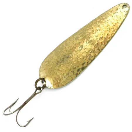 Kaltas žalvaris suteikia šios 9 cm (3 1/2") vartiklės korpusui išskirtinę, duobėtą tekstūrą, kuri atspindi šviesą įvairiomis kryptimis. Šis Amerikoje pagamintas Nebco egzempliorius, pažymėtas produkto kodu 5341, pasižymi solidžiu 21 g (3/4 oz) svoriu, todėl puikiai tinka pasiekti gilesnes struktūras arba atlikti tolimus metimus. Kitoje masalo pusėje aiškiai įspaustas gamintojo pavadinimas ir FlashBait 66 modelio pavadinimas – tai prekės ženklo gamybos USA skiriamasis ženklas. Atsižvelgiant į 4/5 būklę, ant metalo matomos kelios švelnios paviršiaus žymės ir mažos oksidacijos dėmės, būdingos tokio amžiaus masalui, tačiau originalus žalvario blizgesys išlieka stiprus. Įranga paprasta: naudojamas vienas žiedelis tamsintam trišakiui kabliukui pritvirtinti, kurio gėla rodo minimalų nusidėvėjimą.