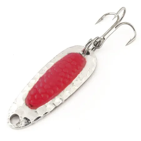 Ryškiai raudonas imituotas lašišos ikro įdėklas užima pagrindinę vietą šioje 3,5 cm (1 1/2") blizgėje, sukurdamas vizualinį stimulą kalto nikelio paviršiuje. Identifikuojama pagal prekės kodą 12188, ši Nebco Pixee sveria 4,5 g (3/16 oz) ir pasižymi storu žalvariniu korpusu, sukurtu stabilumui stiprioje srovėje arba tolimiems metimams. Šis masalas, kilęs iš „National Expert Bait Company“ — šiuolaikinio „Blue Fox“ prekės ženklo pirmtako — yra klasikinis pasirinkimas lašišų ir plienagalvių upėtakių žvejybai. Kalta tekstūra pagauna šviesą iš visų kampų, o raudonas įdėklas pasižymi ryškiu švytėjimu esant silpnam apšvietimui, imituodamas tikrų žuvų ikrų išvaizdą. Furnitūrą sudaro tvirtas trišakis kabliukas, sujungtas stipriu žiedeliu. Pateikiamas 5/5 būklės, egzempliorius pasižymi puikiu paviršiumi ir yra be jokio nusidėvėjimo žymių.