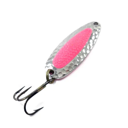 Kalto nikelio žvyneliai atspindi šviesą nuo šios 5,5 cm (2 1/4") žalvarinės blizgės paviršiaus, užtikrindami puikų matomumą įvairiomis vandens sąlygomis. Centrinėje dalyje esantis tekstūrinis rožinis plastikinis įdėklas imituoja lašišos ikrą – tai išskirtinis National Expert Bait Company dizaino bruožas. Ši 14 g (1/2 oz) sverianti blizgė yra masyvios konstrukcijos, skirta tolimiems metimams ir gylio išlaikymui stiprioje upės srovėje. Kitoje pusėje esantis įspaudas PIXEE PAT. PEND. nurodo, kad tai ankstyvosios gamybos JAV gamintojo pavyzdys, prekės kodas 1796, dar prieš jiems tampant žinomiems kaip Blue Fox. Šis egzempliorius yra 5/5 būklės, su švariu, atspindinčiu paviršiumi ir originaliu trišakiu kabliuku, kuris išlieka aštrus ir tvirtas. Blizgės geometrija pritaikyta staigiems judesiams, svyravimui ir vartymuisi tiek giliose ežerų vietose, tiek jūros mūšoje.