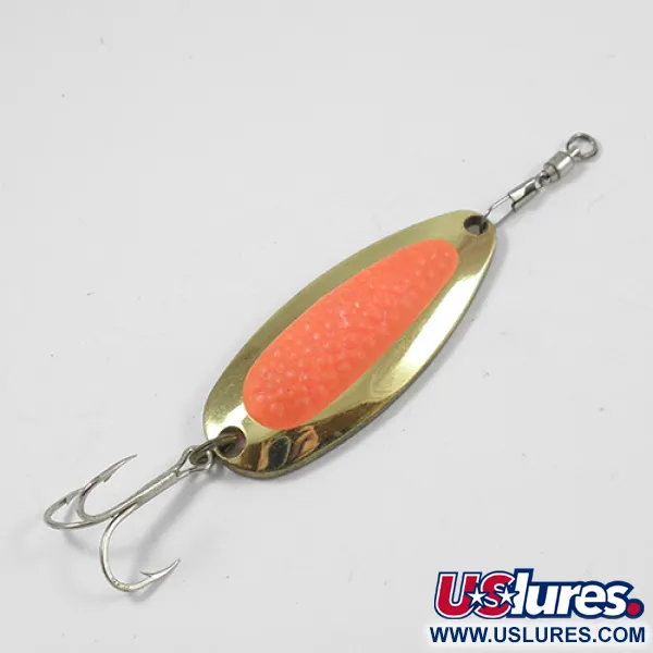Ši 1/2 oz (14 g) svorio blizgė sukurta tolimiems metimams net ir pučiant pakrantės vėjams. Aukso spalvos masyvų žalvarinį korpusą puošia ryškiai oranžinis, lašišos ikrą imituojantis reljefinis intarpas – ši konstrukcija skirta išprovokuoti lašišų ir upėtakių atakas. Apatinėje pusėje aiškiai išspaustas užrašas „Nebco Pixee Pat. No. 40 1/2 oz USA“, nurodantis kilmę ir konkretų modelį (produkto kodas 1949). 5,5 cm (2 1/4") ilgio blizgė turi originalią furnitūrą, įskaitant tvirtą trišakį kabliuką ir viršuje sumontuotą suktuką, mažinantį valo painiojimąsi. Šio egzemplioriaus būklė vertinama 4/5, jo paviršius puikiai išlaikytas ir intensyviai atspindi šviesą. Konstrukcija užtikrina vartymąsi ir riedėjimą giliose upių duobėse arba stabilų svyravimą traukiant ežere. Šis universalus masalas dažnai naudojamas gaudyti plėšriąsias žuvis, tokias kaip lydekos, maskinongai ar ešeriai, įvairiuose gyliuose.