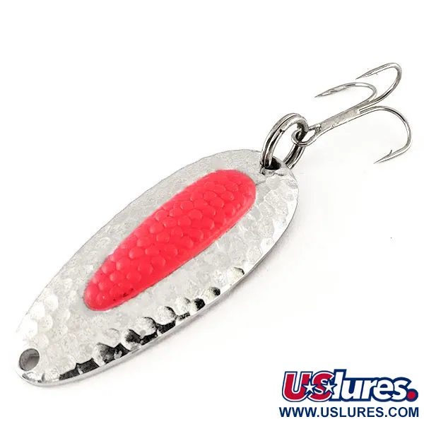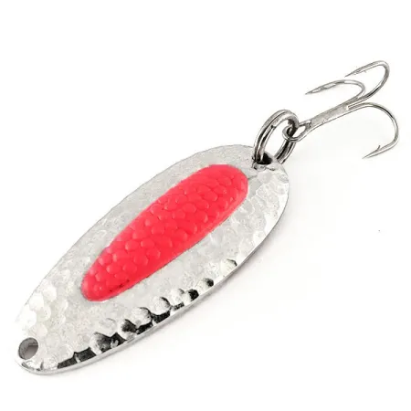 Kalto nikelio tekstūros ant šios blizgės korpuso gaudo šviesą bet kokiu kampu, todėl tai puikus pasirinkimas žvejybai giliuose vandenyse ir esant prastam apšvietimui. 6,5 cm (2 1/2") ilgio ir 24 g (3/4 oz) svorio Nebco Pixee blizgė yra pagaminta iš storasienio žalvario, suteikiančio reikiamą tankį tolimiems metimams net pučiant stipriam pakrantės vėjui. Šis konkretus egzempliorius, pažymėtas prekės kodu 12362, yra originalus JAV pagamintas masalas iš National Expert Bait Company – prekės ženklo, kuris vėliau tapo legendiniu Blue Fox. Išskirtiniausias bruožas yra raudonas plastikinis įdėklas, imituojantis lašišos ikrą; šiame UV modelyje tas įdėklas intensyviai švyti ultravioletinėje šviesoje, kaip parodyta papildomoje nuotraukoje. Masalas turi tvirtą žiedelį ir aštrų trišakį kabliuką, paruoštą tiek vaivorykštiniams upėtakiams ir lašišoms, tiek lydekoms ar jūrinėms žuvims. Jo būklė yra nepriekaištinga (5/5), atspindintis paviršius išlieka ryškus, o įdėklas saugiai įtvirtintas metaliniame rėmelyje. Žvejai dažnai naudoja šias sunkias blizges stipriose upių srovėse, kad pasiektų gilias duobes, kuriose telkiasi žuvys, arba velkiauja ežeruose skirtingu greičiu. Svoris ir aptaki forma užtikrina, kad masalas išliktų giliai vandens sluoksnyje tolygiai traukiant.