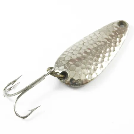 Ši 4 cm (1 1/2") vartiklė su giliai kalto nikelio apdaila yra sukurta siekiant maksimaliai padidinti šviesos atspindžio plotą. Kita pusė išlieka lygi su aiškiu 'NEBCO TOR-P-DO 1 MPLS. MINN.' įspaudu, liudijančiu jos kilmę iš Mineapolio žvejybos įrankių rinkos. Šis egzempliorius, kurio produkto kodas 3277, sveria 7 g (1/4 oz), todėl yra puikus pasirinkimas žvejojant upėtakius ar ešerius spiningu. Furnitūrą sudaro klasikinis trišakis kablys, pritvirtintas tvirtu žiedeliu, kurio paviršiai yra puikiai prižiūrėti. Įvertinta 4/5 būkle, nikelio danga išlaiko aukštos kokybės blizgesį abiejose pusėse su tik nežymiais laiko ženklais. Tvirtinimo skylutė smailėjančiame gale yra švariai išgręžta, paruošta tiesioginiam rišimui arba mažam suktukui.
