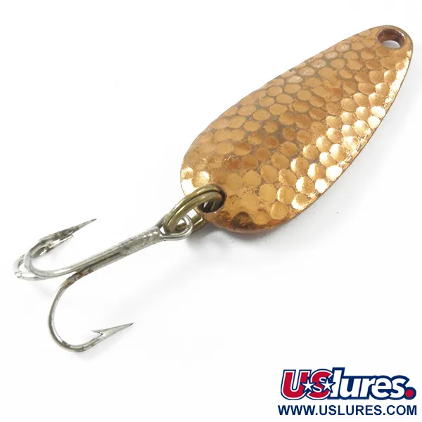 Kalto vario paviršius apibrėžia šios vintažinės blizgės priekinę dalį, sukurtą maksimaliai atspindėti šviesą įvairiais kampais. 7 g (1/4 oz) svorio ir 4 cm (1 1/2") ilgio Nebco Tor-P-Do 1 pasižymi klasikinio lašo formos profiliu, kuris buvo būdingas vidurio amžiaus JAV žvejybos įrankių gamybai. Kitoje masalo pusėje yra lygus varinis paviršius su aiškiai išspaustais užrašais „NEBCO“, „TOR-P-DO-1“ ir kilmės vieta „MPLS. MINN.“, nurodančia Mineapolyje įsikūrusį gamintoją. Furnitūrą sudaro tvirtas žiedelis ir švarus trišakis kablys, o visas masalas turi lengvų senėjimo požymių, kurie vertinami 4/5 būklės reitingu. Įtraukta į sąrašą produkto kodu 3296, galvutės kilpelė išlieka idealiai apvali ir be struktūrinio nusidėvėjimo, todėl tai yra puikus JAV spiningavimo įrangos pavyzdys.