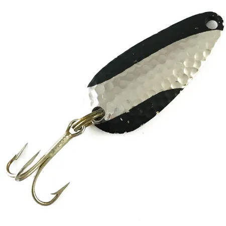 Kalto nikelio tekstūros kartu su ryškiais juodais akcentais apibūdina išskirtinį šios vintažinės blizgės vizualinį profilį. 1 1/2" (4 cm) ilgio ir 1/4 oz (7 g) svorio egzempliorius ant poliruotos nugarėlės turi aiškų „NEBCO“ TOR-P-DO-1 įspaudą bei nuorodą į kilmę Ripley, Miss. Priekinė dalis pasižymi kirstu paviršiumi, skirtu sugauti ir atspindėti šviesą, o galai paryškinti sodriai juoda spalva. Atpažįstama pagal prekės kodą 6235, blizgė turi klasikinį trišakį kabliuką, pritvirtintą tvirtu žiedeliu. Pagaminta iš tvirto metalo, kas būdinga XX a. vidurio JAV gamybai. Būklė puiki – puikiai išlaikyta apdaila ir ryškūs įspaudai, vertinama 5/5. Anga valui yra švari ir tiksliai išgręžta siaurajame lašo formos gale.