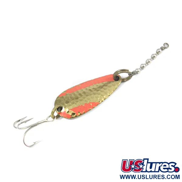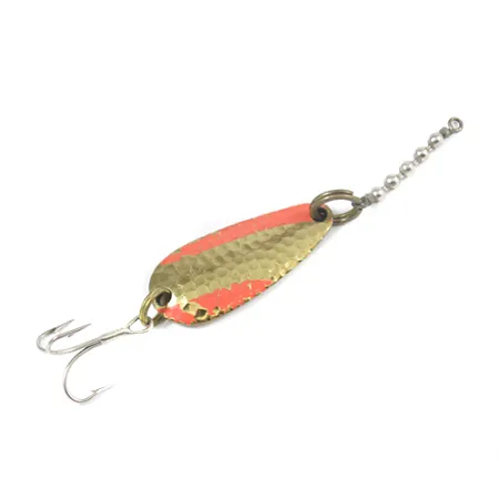Įstrižos raudonos juostos kerta šios 4 cm (1 1/2") blizgės kalamo aukso paviršių, sukurdamos ryškų vizualinį kontrastą. Šis 7 g (1/4 oz) svorio modelis pasižymi giliai išmušta tekstūra priekinėje dalyje, skirta maksimaliai atspindėti šviesą. Apvertus masalą, matoma lygi, poliruota auksinė nugarėlė, aiškiai pažymėta gamintojo spaudais: „Nebco“, „TOR-P-DO-1“ ir „MADE IN USA“. Furnitūra nepažeista, ją sudaro žiedelis, sujungtas su grandininiu suktuku, skirtu išvengti valo susisukimo metant ar velkiaujant. Įvertintas 4/5, masalas turi nedidelių naudojimo žymių, tačiau išlaiko tvirtą konstrukciją ir ryškią spalvą. Prie uodegos žiedeliu pritvirtintas aštrus trišakis kablys užbaigia šį klasikinį amerikietišką gaminį, žymimą prekės kodu 2082.