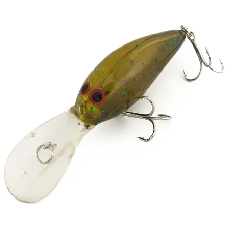 Ryškūs purpuriniai ir žali blizgučiai yra įlieti į šio giliavandenio voblerio pusiau skaidrų alyvinės spalvos korpusą. Šis Norman DD 14, kurio prekės kodas 7478, yra 7 cm ilgio ir sveria 16 g. Jo konstrukcija su vidiniu barškučiu sukelia garsą vandenyje, o neutralus plūdrumas leidžia taikyti įvairias pravedimo technikas. Didelis skaidrus liežuvėlis suprojektuotas pasiekti 3,6–4,2 m gylį, todėl masalas tinkamas tiek spiningavimui, tiek velkiavimui. Ryškios raudonos akys galvos srityje sukuria kontrastingą akcentą alyviniame fone. Furnitūra yra puikios būklės (įvertinimas 5/5), su originaliais žiedeliais ir trišakiais kabliukais. Šis JAV pagamintas egzempliorius pasižymi klasikiniu Norman profiliu ir išskirtiniu plastiku su blizgučiais.