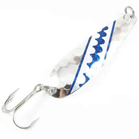 Ši Kanadoje pagaminta 1/2 oz (14 g) svorio vartiklė pasižymi tikro sidabro padengimu, sukurtu specialiai šviesos atspindėjimui dideliame gylyje. Len Thompson Northern King 28 UV (produkto kodas 3530) yra žalvarinė velkiavimo blizgė, kurios ilgis – 3 3/4" (9,5 cm). 1984 m. pristatytoje Northern King linijoje naudojamas sidabravimas, kad metalas išliktų matomas jam leidžiantis gilyn. Šis konkretus pavyzdys turi kaltą tekstūrą priekinėje dalyje, papuoštą mėlynos ir baltos spalvos juostos raštu, užtikrinančiu UV reaktyvumą matomumui gilesniuose vandens sluoksniuose. Kitoje masalo pusėje – švari, korio raštu spausta sidabrinė nugarėlė. Furnitūrą sudaro tvirtas trišakis kablys, pritvirtintas per žiedelį, atitinkantis specialią velkiavimo konstrukciją. Būklė 5/5 – sidabravimas išlieka ryškus, o UV akcentai puikiai išsilaikę per visą korpuso ilgį.