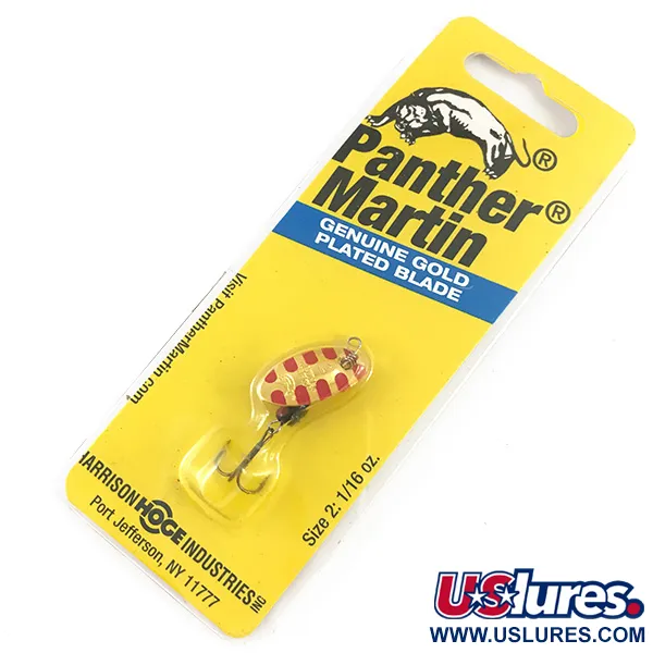 Raudoni įstriži dryžiai ant tikru auksu dengto lapelio apibūdina šią klasikinę 1,77 g (1/16 oz) sukrę. Atpažįstama pagal prekės kodą 4540, ši 2 dydžio sukrė naudoja klasikinį išgaubtą/įgaubtą lapelio dizainą, kuris tvirtinamas tiesiai ant masalo ašies – tai Panther Martin linijos išskirtinumas. 5 cm (2") ilgį papildo pasunkintas korpusas, skirtas metimo stabilumui mažuose upeliuose ar atvirame vandenyje. Pagamintas Dominikos Respublikoje kompanijai Harrison-Hoge Industries, šis konkretus masalas yra nenaudotas, puikiai išsilaikęs originalioje pakuotėje. Lašo formos korpusas ir tiesioginio tvirtinimo lapelis sukonstruoti taip, kad pradėtų suktis vos palietę vandenį. Masalas apginkluotas standartiniais aštriais trišakiais kabliukais, būdingais šiems lengvos klasės favoritams, ir yra paruoštas upėtakių ar ešerių žūklei.