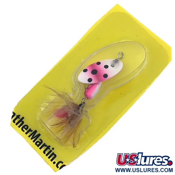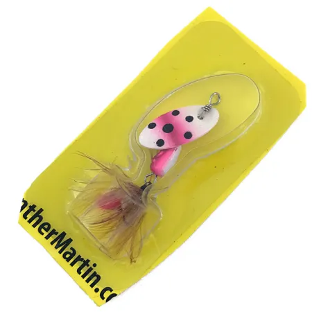 Ši 3/32oz (2,5g) sverianti sukrė pasižymi ryškiu upėtakio spalvinimu: baltas pagrindas su sodriai rožiniais kraštais ir ryškiais juodais taškeliais. Lapelis sumontuotas tiesiai ant ašies – tai firminė Panther Martin konstrukcija be tradicinio žiedelio, leidžianti lapeliui suktis greičiau. 2" (5cm) ilgio masalas turi trišakį kabliuką, papuoštą geltonos ir rusvos spalvos plunksnomis. Šis pavyzdys (kodas 4992) yra originalioje geltonoje lizdinėje pakuotėje ir yra nenaudotas. Lašo formos korpusas yra pasunkintas tiksliems metimams, o ant pakuotės nurodyta kilmės šalis – Dominikos Respublika (pagaminta Harrison-Hoge Industries). Kitoje kortelės pusėje nurodytas istorinis gamintojo adresas Port Jefferson, NY, bei standartiniai techniniai įspėjimai.