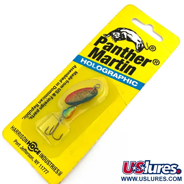 Ryški holografinė apdaila pasižymi šios Panther Martin sukrės lapelis, atspindintis raudonus, mėlynus ir auksinis tonus, pateiktas originalioje Harrison Hoge Industries pakuotėje. Pažymėtas prekės kodu 8334, šis 1 3/4 colio (4,5 cm) masalas demonstruoja inline tipo sukrės tikslumą, kur lapelis sukasi tiesiai aplink centrinę ašį. Šis konkretus egzempliorius sveria 3/32 oz (2,5 g), turi pasunkintą geltoną lašo formos korpusą ir aštrų trišakį kabliuką. Surinkta Dominikos Respublikoje iš JAV ir užsienio dalių, pakuotė pabrėžia jos kilmę iš Port Jefferson, NY. Masalas nenaudotas, išlaikęs originalų gamyklinį blizgesį, todėl jo būklė vertinama 6 balais. Šioje holografinėje serijoje naudojami šviesą lūžtantys paviršiai, sukurti imituoti mažų žuvelių žvynus esant skirtingam vandens skaidrumui.