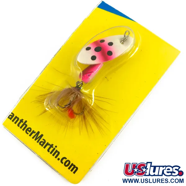 Ši 4 g (1/8 oz) svorio sukriukė pasižymi išskirtiniu „Upėtakio“ spalviniu raštu ant balto lapelio, dekoruoto rožine išilgine juosta ir juodais taškeliais. 5 cm (2") masalas turi klasikinį Panther Martin dizainą, kai lapelis montuojamas tiesiai ant ašies – tokia konstrukcija užtikrina momentinį sukimąsi. Šis egzempliorius, kurio prekės kodas 4601, pateikiamas ant originalios ryškiai geltonos Harrison Hoge Industries pakuotės kortelės. Lašo formos korpusas nudažytas vientisa rožine spalva, derančia prie lapelio akcentų, o gale sumontuotas trišakis kablys su minkštomis rudomis plunksnomis. Masalas nenaudotas, metalinės dalys išlaikiusios blizgesį, o pakuotė tvarkinga. Italijoje suprojektuotos sukriukės vertinamos dėl sunkaus korpuso, palengvinančio tolimus metimus. Galinėje kortelės pusėje pateikiama prekės ženklo platinimo iš Port Jefferson, NY, istorija bei pabrėžiami dengti arba holografiniai lapeliai, sukurti atspindėti šviesą įvairiomis sąlygomis.