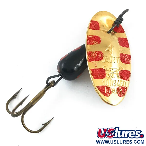 Paženklintas užrašu „ITALY“ ir seka „1009450“, šios senovinės sukrės auksinis lapelis atspindi turtingą europietišką masalo gamybos istoriją. Šis Panther Martin 4 modelis, registruotas prekės kodu 4666, pasižymi auksuotu lapeliu su raudonais įstrižais brūkšniais ir juodu lašo formos kūneliu su oranžiškai raudonais taškeliais. Masalo ilgis yra 4 cm (1 1/2"), o svoris – 4 g (1/8 oz). Konstrukcija remiasi garsiąja prekės ženklo sistema, kur lapelis sukasi tiesiai ant ašies, sukuriant unikalų sukimosi profilį. Šiuo metu masalo būklė vertinama 4/5: metaliniai paviršiai išlaikę blizgesį, o dažai ant pasunkinto kūnelio yra beveik nepažeisti. Bronzinis trišakis kabliukas yra originalus, turintis praėjusio amžiaus vidurio furnitūrai būdingą apdailą. Lašo formos kūnelis sukurtas užtikrinti stabilų traukimą esant skirtingam srovės greičiui. Skaičius „4“, ryškiai įspaustas ant lapelio, nurodo, kad tai universalus vidutinio lengvumo dydis upėtakių ir ešerinių žuvų žūklei.