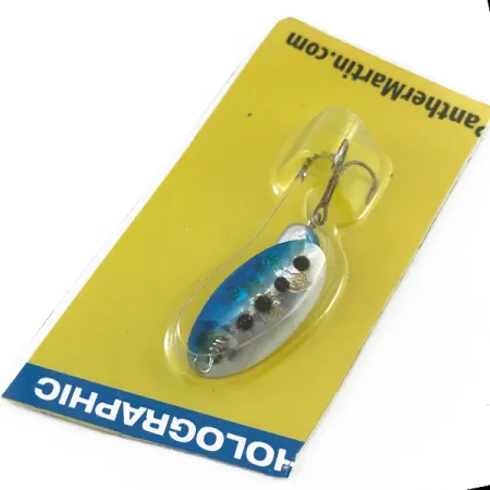 Holografinė apdaila, tokia kaip šis įspūdingas Sidabrinės / Mėlynos spalvos perėjimas ant lapelio, sukurta taip, kad maksimaliai padidintų blyksnius esant įvairiam apšvietimui. Ši Panther Martin 4, sverianti 4 g (1/8 oz) ir esanti 4 cm (1 1/2") ilgio, naudoja garsiąją prekės ženklo ant ašies montuojamo lapelio konfigūraciją, leidžiančią lapeliui suktis tiesiai ant vielos. Penki juodi taškai tiksliai uždėti ant holografinės folijos, kad sudarytų ryškų vizualinį kontrastą, kuriuo kliaujasi upėtakių žvejai srauniuose vandenyse. Suktukė, žymima prekės kodu 5168, yra nenaudota ir pateikiama originalioje geltonoje mažmeninėje pakuotėje. Kortelės nugarėlėje gamintoju nurodoma „Harrison-Hoge Industries“, pabrėžiant pasunkinto korpuso konstrukciją, skirtą metimams į siauras vietas. Gale sumontuotas aštrus trišakis kablys užbaigia klasikinę sistemą, kuri išliko beveik nepakitusi ištisas kartas.