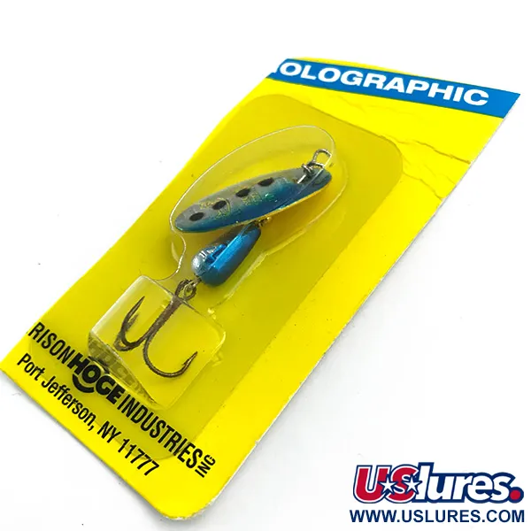 Žėrintys holografiniai žvyneliai atspindi šviesą ant išgaubtos šios klasikinės 1/8oz (4g) sukrės nugarėlės. Pagaminta „Rison Hoge Industries“ Port Jeffersone, Niujorke, šis egzempliorius demonstruoja prekės ženklo apdailos technologijų evoliuciją su išskirtiniu „Blue Trout“ raštu, pasižyminčiu giliai mėlynais atspalviais ir tiksliomis juodomis dėmėmis ant metalinio pagrindo. 4 cm (1 1/2") masalas sukurtas aplink pasunkintą lašo formos korpusą ir unikalią lapelio konstrukciją, kuri sukasi tiesiai ant ašies. Ši konstrukcija, gamintojo vizitinė kortelė, skirta giliam masalo pateikimui tekančiame vandenyje. Masalas išlieka pritvirtintas prie originalios geltonos kortelės po skaidria pakuote, išlaikant sidabrinės spalvos trišakio kabliuko ir holografinės folijos vientisumą. Prekė nenaudota. Būklė: 6. Identifikuojama pagal produkto kodą 5459, ji reprezentuoja klasikinę Long Ailando žūklės reikmenų gamybos erą, kai holografiniai elementai pirmą kartą buvo integruoti į tradicinius masalų profilius.