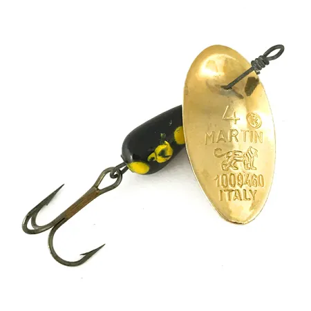 Šis 4 g (1/8 oz) svorio ir 4 cm (1 1/2") bendro ilgio pavyzdys demonstruoja ankstyvosios Italijos gamybos meistriškumą. Išgaubtas auksinis lapelis yra giliai įspaustas su dydžio numeriu 4, Panther Martin prekės ženklu, klasikiniu liūto logotipu, patento numeriu 1009460 ir itališka kilme. Firminis lašo formos korpusas padengtas ryškaus kontrasto juodais dažais su geltonais taškais – šis raštas istoriškai vertinamas žvejų tiek skaidriame, tiek drumstame vandenyje. Sukonstruota su lapeliu, sumontuotu tiesiai ant ašies be lankelio, ši konstrukcija sukuria aptakų profilį, kuris pradeda suktis tą pačią akimirką, kai pasiekia vandenį. Šis konkretus masalas (kodas 7393) yra puikios 5/5 būklės, švininio korpuso dažai ir lapelio metalinė danga pasižymi išskirtiniu aiškumu. Gale sumontuotas aštrus, bronzuotas trišakis kablys, pritvirtintas prie tvirtos vielos kilpos.