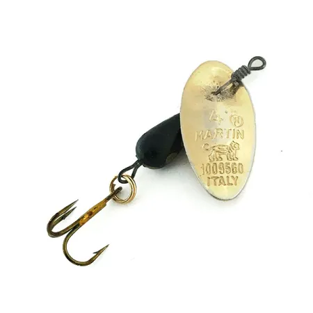 Ikoniškas liūto logotipas ir „ITALY“ žyma, įspausta tiesiai į auksiniu sluoksniu dengtą metalą, išskiria šį autentišką Italijoje pagamintą Panther Martin 4. Šis 4 g (1/8 oz) sukriukas pasižymi firminiu lašo formos korpusu, dažytu kontrastinga juoda spalva su ryškiais geltonais taškais. 4 cm (1 1/2") ilgio nuo kilpelės iki kabliuko konstrukcija pabrėžia unikalų prekės ženklo „in-line“ dizainą, kai lapelis montuojamas tiesiai ant ašies be jokio lankelio. Ant paties lapelio įrašytas numeris 1009560 ir Martin vardas, patvirtinantis jo vietą šių klasikinių upėtakinių masalų linijoje. Aštrus trišakis kablys pritvirtintas tvirtu žiedeliu, rodančiu originalios furnitūros kokybę. Kataloge įrašytas 8985 prekės kodu, šis egzempliorius yra puikios būklės, įvertintas 5/5 balais už ryškų dažymą ir blizgius metalinius paviršius.