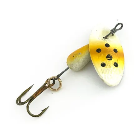 Ant lapelio išspaustas užrašas „MADE IN ITALY“ liudija apie klasikinį Panther Martin prekės ženklo meistriškumą. Šis 4 g (1/8 oz) svorio modelis, gaminio kodas 9264, pasižymi ikoniška konstrukcija su per einančia ašimi, kur lapelis sukasi tiesiai ant vielos be jokių lankelių. 4 cm (1 1/2") ilgio masalas yra „Brown Trout“ spalvinimo, kurį sudaro geltonos ir kreminės spalvos gradientas su ryškiais juodais taškeliais tiek ant lapelio, tiek ant pasunkinto korpuso. Konstrukciją sudaro originali vielinė ašis, auksinio atspalvio žiedelis ir bronzinis trišakis kablys. Būklė vertinama 5/5, dažai ant lašo formos švininio korpuso išlieka ryškūs ir aiškūs. Šis konkretus modelis skirtas žvejybai lengvais valais, pirmiausia metimams į siauras srovės vietas.