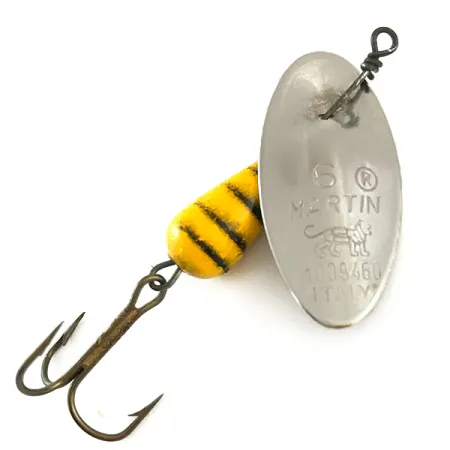 Ant nikelinio lapelio aiškiai iškalta žymė „6 MARTIN“ kartu su klasikiniu liūto logotipu patvirtina autentišką itališką kilmę. Šis konkretus modelis, koduojamas kaip prekės kodas 6329, pasižymi firminiu lašo formos korpusu, nudažytu ryškiai geltona spalva su ryškiais juodais horizontaliais dryžiais. Įvertintas 5/5, masalas yra išskirtinės būklės, išlaikęs originalią gamyklinę tiek pasunkinto korpuso, tiek poliruoto nikelio lapelio apdailą. 6 g (3/16oz) svorio ir 5 cm (2") ilgio masalas yra „in-line“ tipo sukrė, kurioje lapelis sumontuotas tiesiai ant vielos ašies be lankelio. Kitoje lapelio pusėje puikuojasi patento numeris 1039460 ir gilus graviravimas „ITALY“, atspindintis šių ankstyvųjų importo gaminių gamybos erą. Gale pritvirtintas tamsus, aštrus trišakis kablys užbaigia šį klasikinį masalą, skirtą tiksliems metimams upėtakių upeliuose ar lengvam spiningavimui gėluose vandenyse.