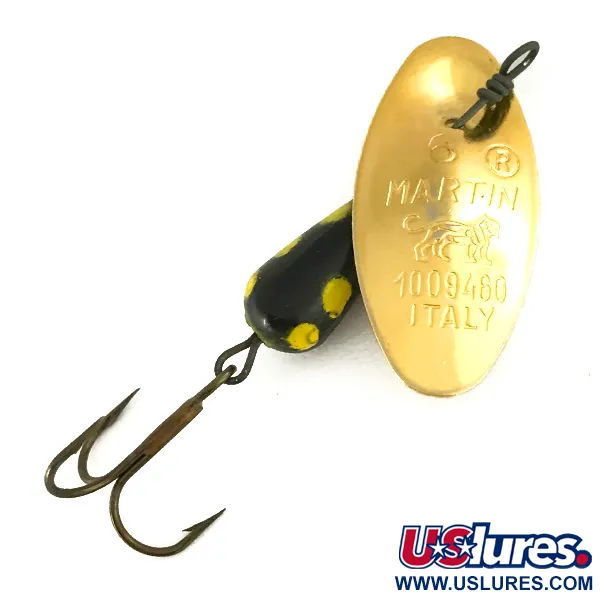 Šis modelis su kultine šokančios katės emblema ir užrašu „ITALY“ tiesiai ant auksinio paviršiaus lapelio pabrėžia Panther Martin 6 europietišką gamybos paveldą. Ši klasikinė „inline“ tipo sukriukė, žymima prekės kodu 7392, pasižymi firminė konstrukcija be lankelio, kur lapelis tvirtinamas tiesiai ant ašies per savo angą. 5,1 cm (2") ilgio masalas turi pasunkintą lašo formos korpusą, padengtą juodu emaliu su ryškiai geltonais taškais. Šis konkretus egzempliorius yra nenaudotas, su švariu auksiniu lapeliu ir ryškiomis dažytomis detalėmis. Bronzuotas trišakis kablys pritvirtintas prie originalios vielinės ašies, kuri baigiasi tradicine kilpa valui tvirtinti. Kolekcionieriai įvertins aiškiai įskaitomą numerį „1009460“, išmuštą ant lapelio, nurodantį jo vietą prekės ženklo gamybos istorijoje.