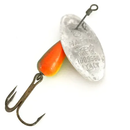 Ant sidabrinio lapelio išgaubtos pusės aiškiai iškalta kilmė „ITALY“ ir patento numeris 1009560, liudijantys, kad šis Panther Martin 6 yra tikra Europos žūklės istorijos dalis. 6 g svorio ir 5 cm ilgio egzempliorius pasižymi klasikiniu lašo formos kūnu, nudažytu ryškiu raudonos ir oranžinės spalvos gradientu ant žalio pagrindo. Ši specifinė konstrukcija naudoja tiesiogiai ant ašies sumontuotą lapelį, kuris leidžia jam plačiau suktis ir sukelia išskirtinę vibraciją traukiant masalą. Konstrukciją papildo tvirtas trišakis kabliukas, turintis nedidelių senėjimo požymių, tačiau išliekantis patikimas eksponavimui ar naudojimui. Būklė vertinama 4/5, masalas atrodo puikiai su nedideliais paviršiaus nusidėvėjimo požymiais, pabrėžiančiais jo vintažinį pobūdį. Ant sidabrinio lapelio išspaustas išskirtinis šokančios katės logotipas, nurodantis 7707 seriją. Sunkus lašo formos kūnas sukurtas taip, kad tolygiai paskirstytų masę tolimesniems ir tikslesniems metimams į siauras vandens telkinių vietas.