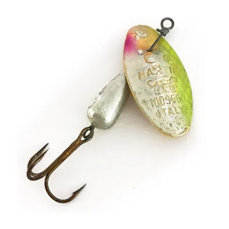 Įspaudas ant sidabrinio lapelio nurodo itališką kilmę ir JAV patentą 1 009 560, kuris yra šių klasikinių sukriukių skiriamasis ženklas. Šis 5,3 g (3/16 oz) modelis pasižymi firminiu lašo formos korpusu su neapdoroto metalo apdaila, išlaikančiu 5 cm (2") bendrą ilgį. Priekinėje pusėje lapelis turi ryškų Rainbow Chartreuse ir rožinės spalvos perėjimą ant sidabrinio pagrindo, o kitoje pusėje matomas poliruoto žalvario tonas. Mažas žalvarinis karoliukas tarnauja kaip guolis tarp lapelio ir pasunkinto korpuso ant vientisos vielos ašies. Trišakis kablys rodo, kad užkarpėlės buvo užspaustos, tikriausiai naudojimui „pagauk-paleisk“ tipo telkiniuose. Vertinamas 4/5 būkle, masalas turi lengvų naudojimo žymių, tačiau išlaiko funkcionalią vielos kilpą valui tvirtinti. Lapelis sumontuotas tiesiai ant ašies – tai išskirtinė konstrukcija, kuri maksimaliai padidina vibraciją į pasunkintą korpusą.
