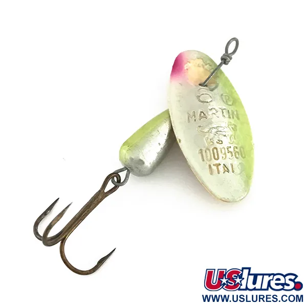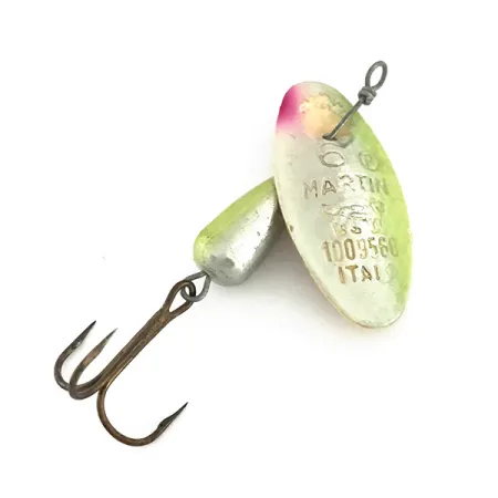 Sidabrinio lapelio metale aiškiai įspaustas „ITALY“ ženklas patvirtina šios vintažinės Panther Martin 6 europietišką kilmę. 6 g (3/16 oz) svorio ir 5,5 cm (2 1/4") ilgio sukrė pasižymi specifiniu spalvų deriniu: sidabriniu pagrindu su „chartreuse“ atspalviu ir ryškiu rožiniu akcentu gale. Lašo formos korpusas, sukurtas svorio paskirstymui metimo metu, yra derančių „chartreuse“ ir sidabro tonų. Pastebima šio modelio (kodas 8537) techninė savybė – lapelis sumontuotas tiesiai ant ašies, o ne ant lankelio, todėl jis sukasi fiksuota trajektorija aplink centrinę vielą. Įrangą sudaro tamsintos apdailos trišakis kablys. Šis egzempliorius yra 5/5 būklės, išlaikęs originalius dažus ir ryškius įspaudus, įskaitant identifikatorių 1009560 lapelio paviršiuje.