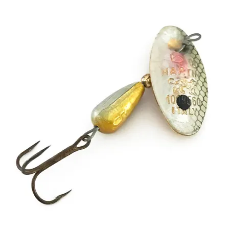 Šis egzempliorius su įspaustu užrašu „Italy“ ant išskirtinio lapelio demonstruoja meistriškumą, padėjusį sukurti „Panther Martin“ prekės ženklo reputaciją. 3/16 uncijos (6 g) svorio ir 2 1/4 colio (5,5 cm) ilgio 6 dydžio sukriukė pasižymi ikoniška konstrukcija, kai lapelis montuojamas tiesiai ant ašies be jokių laikiklių. Lapelio apdaila itin efektinga: vienoje pusėje pavaizduotas sidabrinis korio raštas su subtiliu vaivorykštės akcentu prie kilpelės, o kitoje pusėje – lygus auksinis poliravimas. Sunkus lašo formos korpusas yra padalintas į sidabrinę viršutinę ir auksinę apatinę dalis. Šis masalas, identifikuojamas pagal prekės kodą 8539, turi tvarkingą trišakį kabliuką ir beveik neturi nusidėvėjimo žymių, todėl jo būklė vertinama 5/5. Kolekcininkai įvertins aiškius, iškilusius ženklus, įskaitant „MARTIN“ ir „ITALY“, matomus ant sidabrinio paviršiaus. Konstrukcija išlieka tvirta, o viela tiesi – tai būdinga šiems Italijoje pagamintiems modeliams, skirtiems tiksliems metimams upėtakių upeliuose ar mažesnėse upėse.