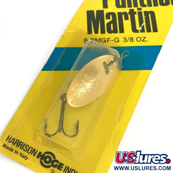 Spindintis auksuotas lapelis yra šios klasikinės sukriukės šerdis, sukurta atspindėti šviesą kiekvieno apsisukimo metu. Šis 10,6 g (3/8 oz) svorio egzempliorius yra sunkesnis gamos variantas, užtikrinantis didesnį gylį ir metimo nuotolį. Pažymėtas prekės kodu 9 PMGF-G, masalas pasižymi firminiu lapelio tvirtinimu tiesiai ant ašies, kas yra ankstyvųjų prekės ženklo modelių bruožas. Šis modelis buvo pagamintas Italijoje įmonei Harrison-Hoge Industries iš Smithtown, N.Y., pažymint specifinę Europos gamybos ir JAV platinimo erą. Prekė yra nenaudota originalioje geltonai mėlynoje pakuotėje, kuri išsaugojo auksinį padengimą ir aštrų trišakį kabliuką pradinės būklės. Kompaktiškas lašo formos korpusas yra subalansuotas stabiliam darbui traukiant masalą įvairiose srovėse.