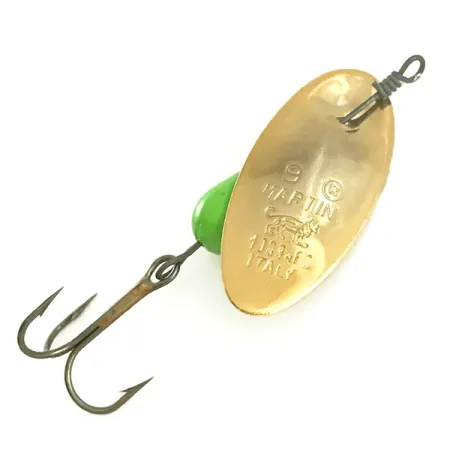 Ant auksu dengto lapelio aiškiai įspaustas skaičius „9“, kartu su prekės ženklu „MARTIN“ ir išskirtiniu tigro logotipu virš kilmės žymos „ITALY“. Šis 9 g (1/3 oz) svorio ir 5,5 cm (2 1/4 colio) ilgio egzempliorius atspindi klasikinį „inline“ dizainą, kuris išgarsino gamintoją. Lašo formos korpusas padengtas vientisais žaliais dažais, o mažas aukso spalvos karoliukas skiria korpusą nuo lapelio sukimosi taško. Šis masalas, identifikuojamas produkto kodu 6596, yra nenaudotos būklės, pasižymintis švariomis linijomis ir ryškiais įspaudais, būdingais itališkai gamybai. Konstrukciją sudaro tvirta vielos ašis ir aštrus trišakis kabliukas.